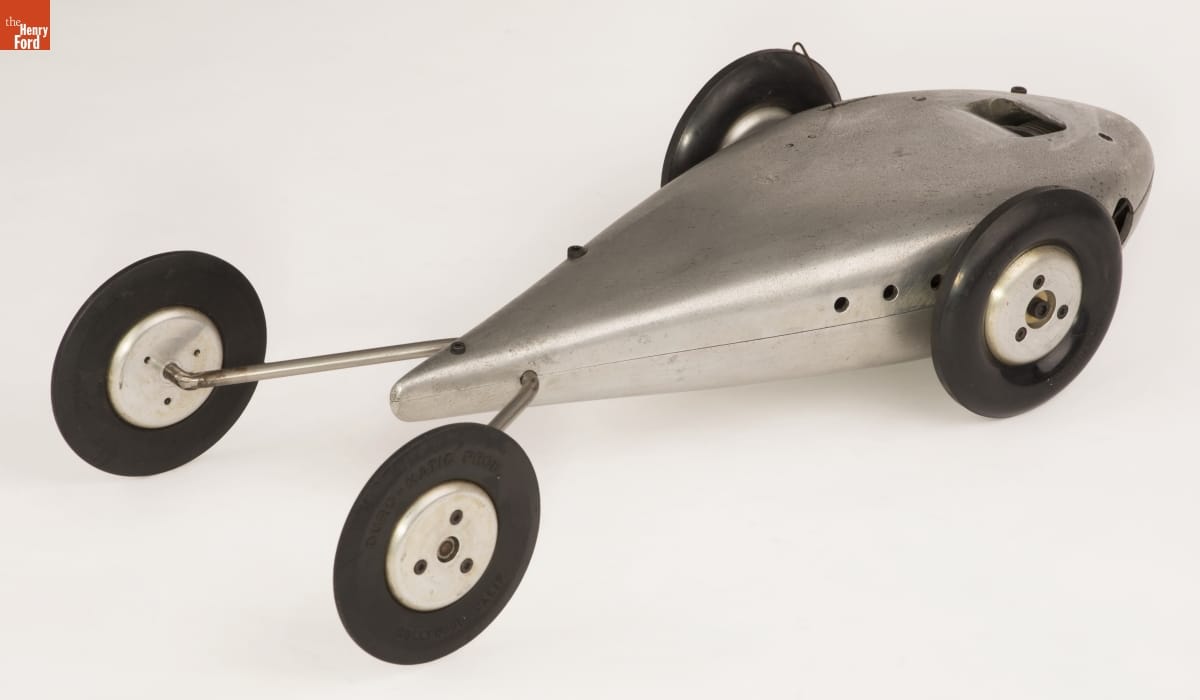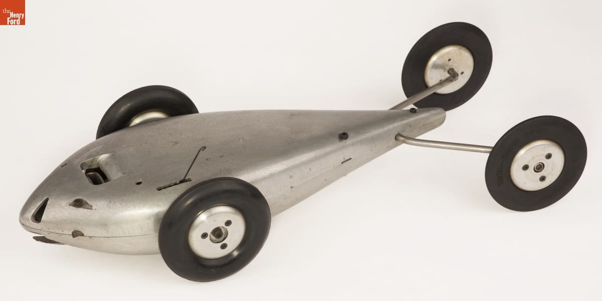 Tether cars, gas-powered model race cars, were popular in the 1930s and 1940s. They were raced individually while tethered to a central pivot, or against each other on a scaled-down board track. This Borden car is a teardrop streamliner with a cast aluminum top and pan. Streamliner models were designed for speed rather than fidelity to existing full-sized cars.