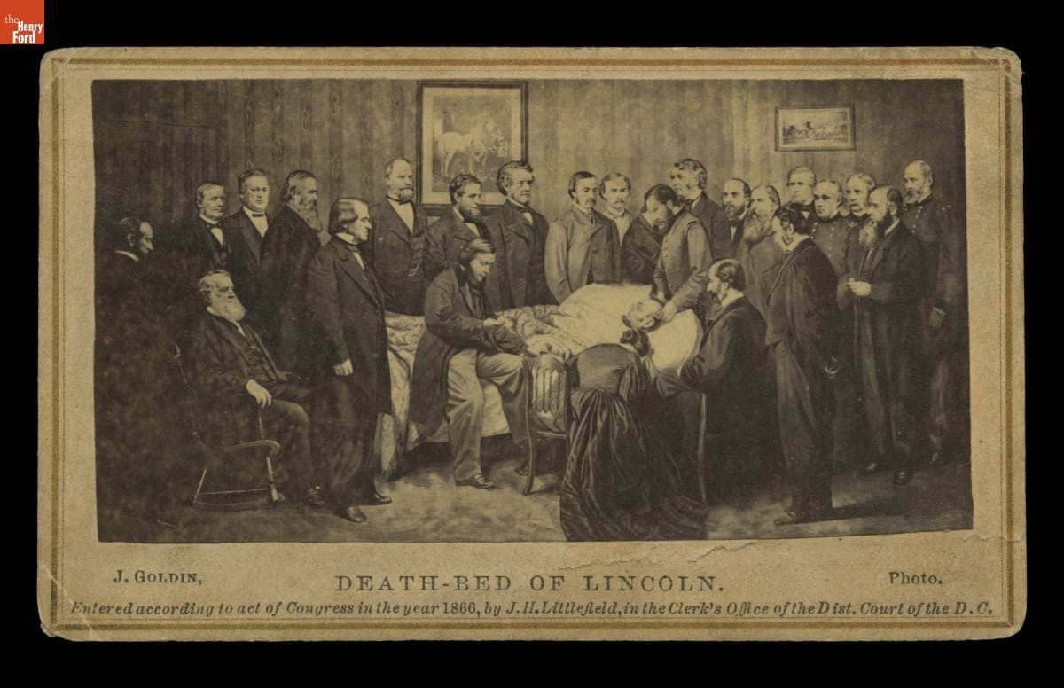 Printed on front, lower edge: J. GOLDIN, Photo. / DEATH-BED OF LINCOLN. / Entered according to Act of Congress in the year 1866, by J.H. Littlefield, by the Clerk's Office of the Dist. Court of the D.C. Photographer's imprint on back: JOHN GOLDIN / Photographer / No. 1 Market Space / PENN. AVE. / WASHINGTON D.C. / Additional copies from this plate / can be had if desired.