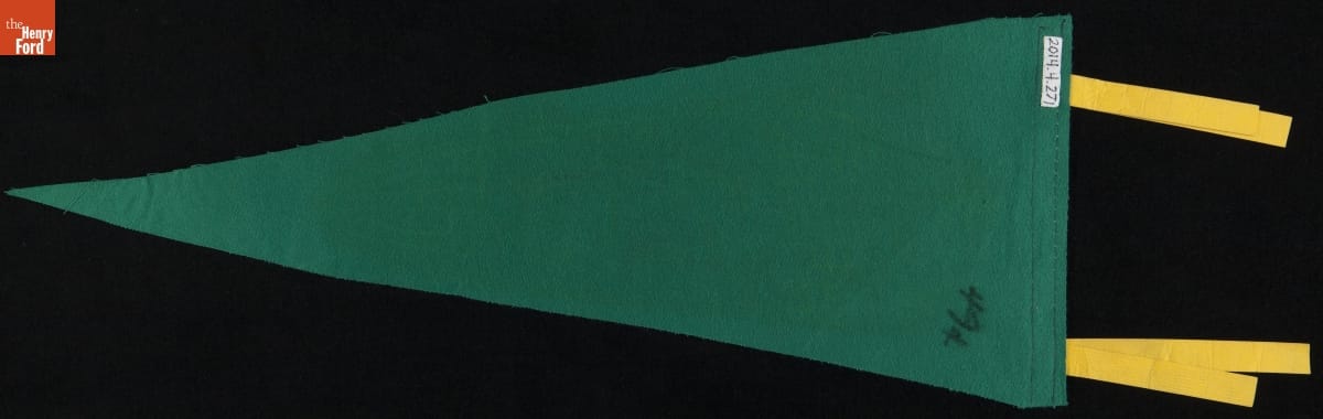 Tourists purchase simple, inexpensive souvenirs as proof of their travels. These mementos transport vacationers back to the places they visited and the things they did. In the mid-20th century, felt pennants were trendy. This pennant depicts the Corn Palace -- a community entertainment venue and world-famous roadside attraction -- in Mitchell, South Dakota. Each year artists redecorate the exterior murals using naturally colored corn, grasses and other grains.
