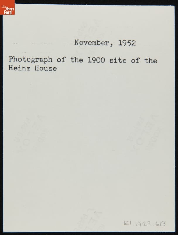 Enterprising Henry J. Heinz began his successful business by bottling horseradish in the basement of his parents' home in Sharpsburg, Pennsylvania. In 1904, the house was relocated to the main plant in Pittsburgh, Pennsylvania, before moving to Greenfield Village in 1953. This photograph from 1952 shows a gas station on the land next to the original site of the Heinz House in Sharpsburg.