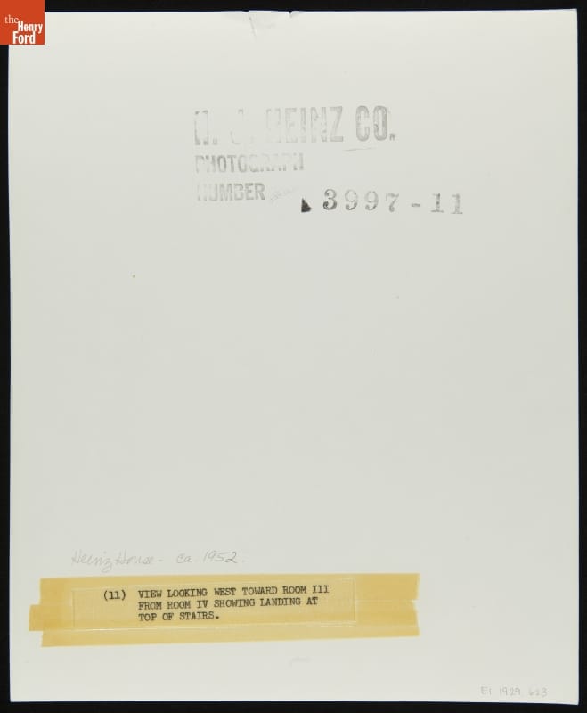 Enterprising Henry J. Heinz began his successful business by bottling horseradish in the basement of his parents' home in Sharpsburg, Pennsylvania. In 1904, the house was relocated to the H. J. Heinz main plant in Pittsburgh, Pennsylvania. This photograph of the interior of the Heinz House was taken in 1952, just before its relocation to Greenfield Village in 1953.