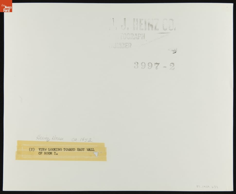Enterprising Henry J. Heinz began his successful business by bottling horseradish in the basement of his parents' home in Sharpsburg, Pennsylvania. In 1904, the house was relocated to the H. J. Heinz main plant in Pittsburgh, Pennsylvania. This photograph of the interior of the Heinz House was taken in 1952, just before its relocation to Greenfield Village in 1953.