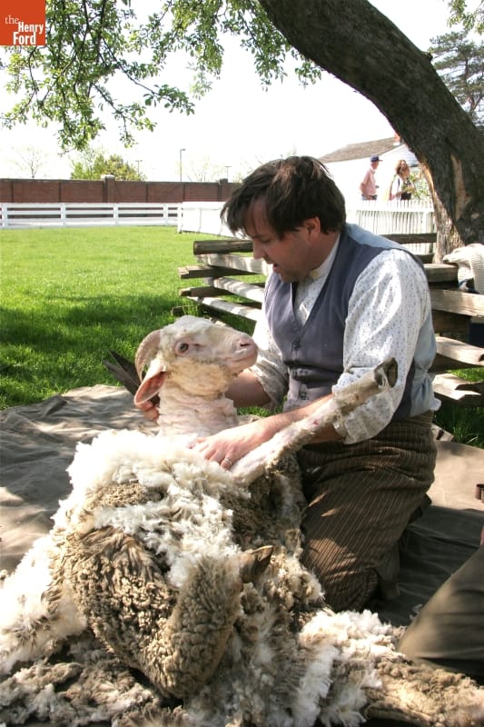 Heavy coats of fine wool made Merino sheep a popular breed among nineteenth-century wool producers. Every spring, shearers carefully navigated blade shears to remove each sheep's thick fleece -- a process that could take several hours. More than a century later, presenters demonstrate this labor-intensive blade-shearing process at Firestone Farm in Greenfield Village.