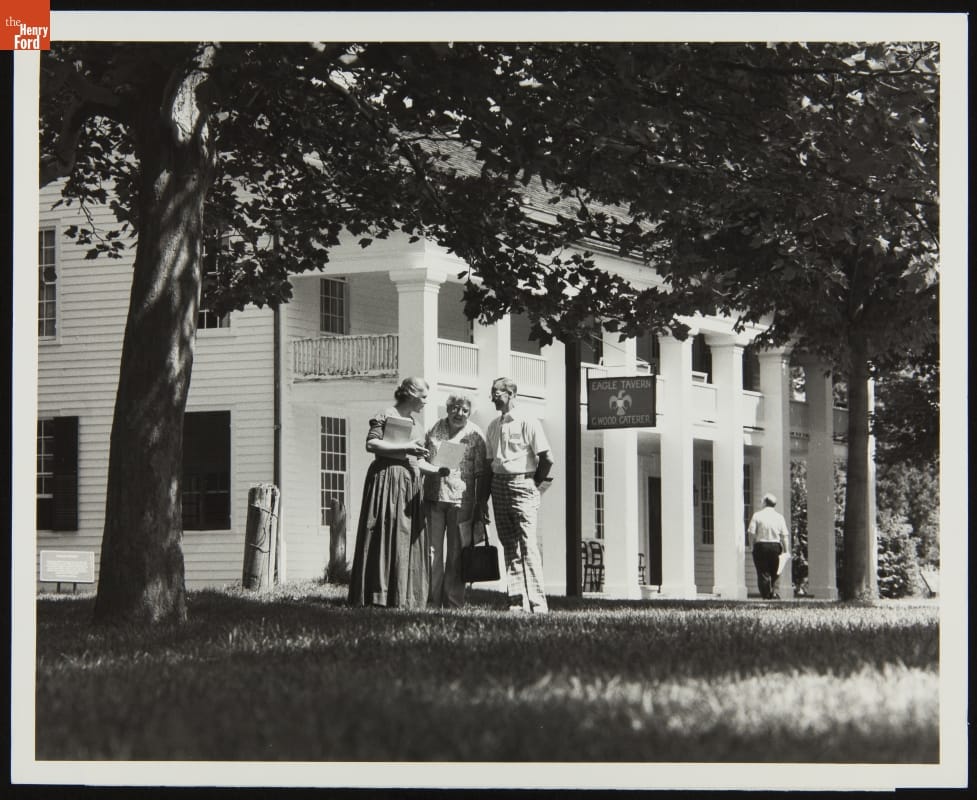 Historical Presenter with Visitors outside Eagle Tavern, Greenfield Village, 1982
