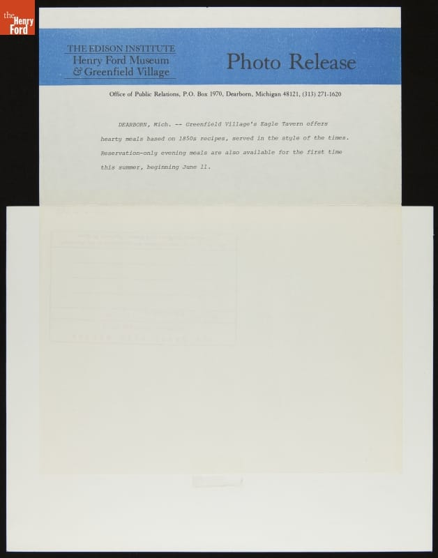 In the early 1980s, Henry Ford Museum & Greenfield Village began assessing and upgrading the interpretation of many buildings, focusing on the dramatic changes that Americans experienced during the 1800s. This included reinterpreting Clinton Inn to its 1850s era, when proprietor Calvin Wood operated the building as Eagle Tavern. This photograph, from a 1982 Press Release, re-creates that era.