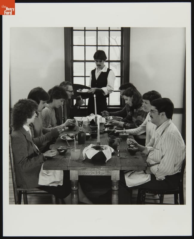 In the early 1980s, Henry Ford Museum & Greenfield Village began assessing and upgrading the interpretation of its buildings, focusing on the dramatic changes that Americans experienced during the 1800s. This included reinterpreting Clinton Inn to its 1850s era, when proprietor Calvin Wood operated the building as Eagle Tavern. This photograph, from 1982, re-creates the dining experience of that era.
