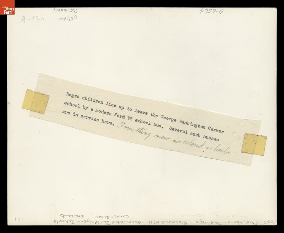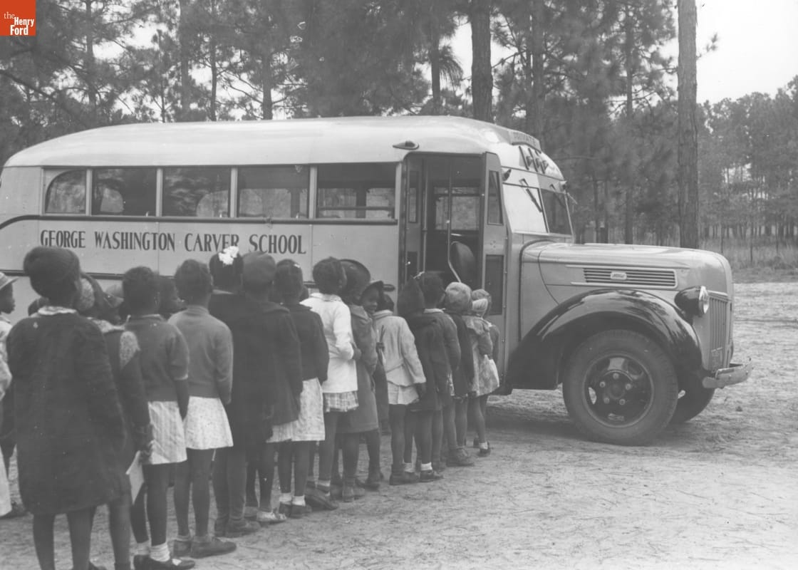 Henry Ford purchased vast amounts of land around Bryan County, Georgia, beginning in the 1920s. After acquiring the property, Ford became interested in the economic and civic improvement of the area. He built schools, churches and community centers. In 1939, Ford founded the George Washington Carver School. This image shows children boarding a bus which took them to and from school.