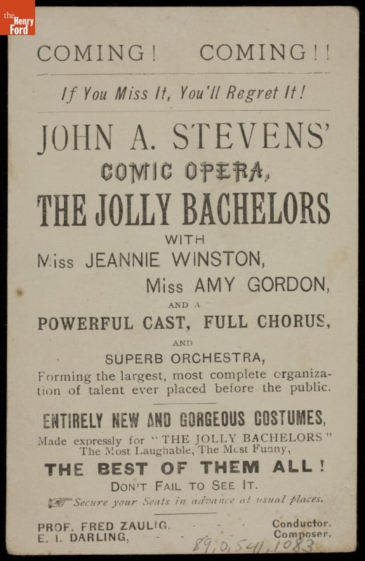 Trade Card for Upcoming Performances of "The Jolly Bachelors," John A. Stevens' Comic Opera Co., 1880-1900