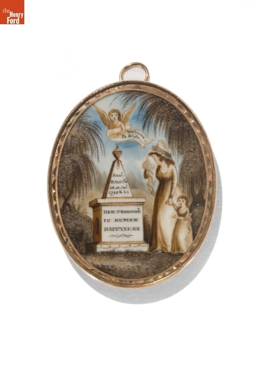 Before the 20th century, death came early and often. One way people coped was to wear jewelry as memorials to their loved ones. Over the centuries, mourning jewelry followed the prevailing fashions. Shortly after independence, Americans favored illuminated, miniature brooches and pendants painted on ivory. These featured shapes derived from classical design, symbols such as urns and weeping women dressed as ancient Romans.