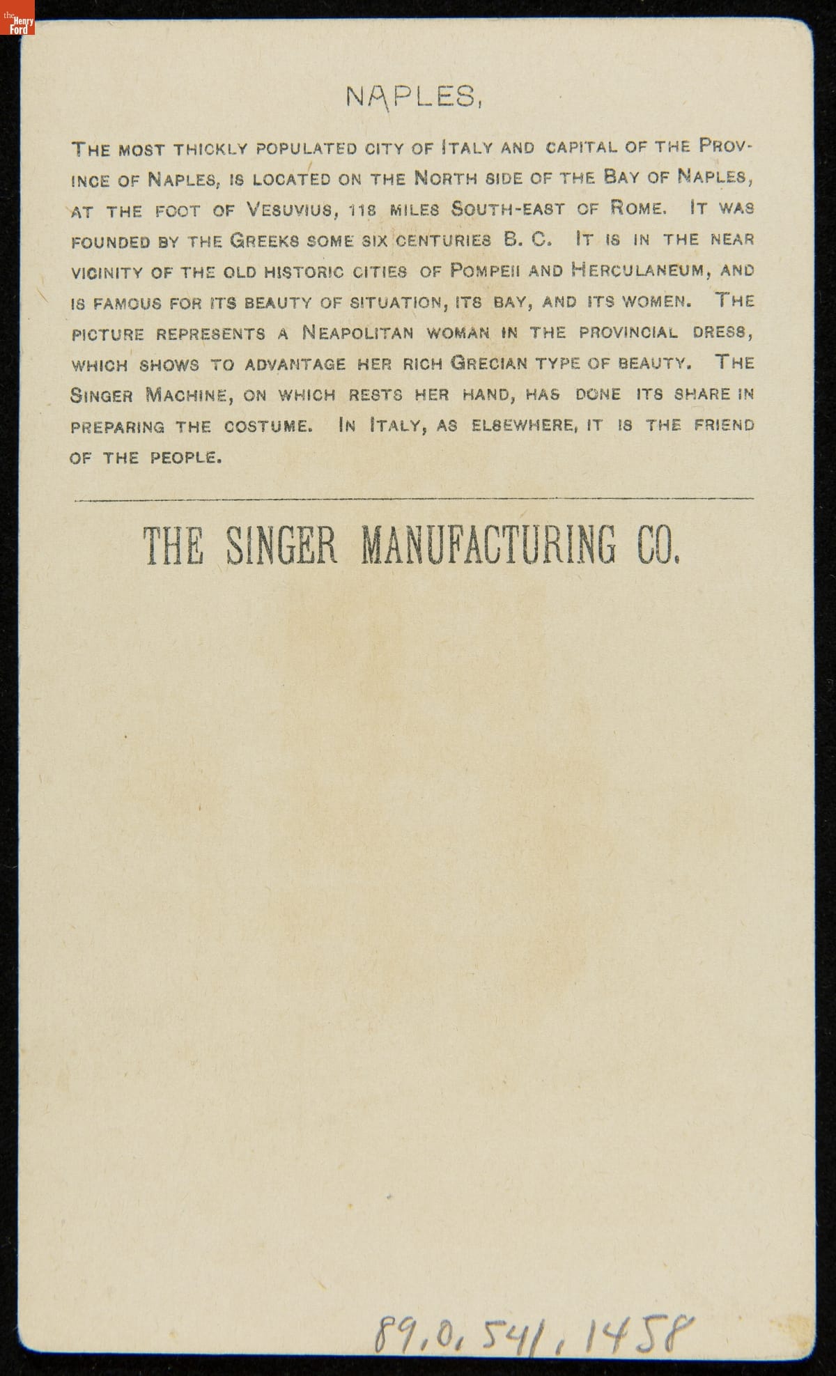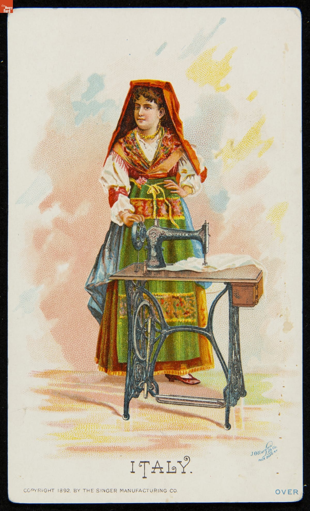 As color printing gained momentum in the late 19th century, trade cards became a major means of advertising goods and services. Americans enjoyed and often saved the vibrant little advertisements found in product packages or distributed by local merchants. The Singer Sewing Machine Company had a series of trade cards, like this one, offering images of Singer machine users from around the world in their national dress.