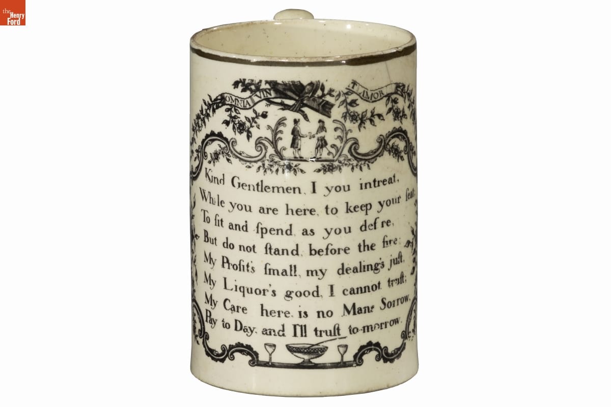 Omnia Vin [illegible] Amor / Kind Gentlemen, I you intreat, / While you are here, to keep your feat; / To sit and spend, as you desire; / But do not stand before the fire; / My profits small, my dealings just, / My Liquor's good, I cannot trust; / My Care here, is no Mans Sorrow, / Pay to Day, and I'll trust to-morrow.