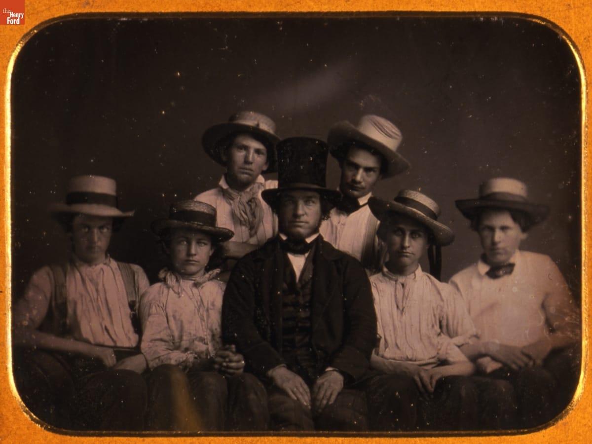 L.W. Cole, co-editor of the Argus newspaper in Ann Arbor, Michigan, from 1846 to 1854, sits with his employees in this daguerreotype from about 1850. Most photographs of this type were taken of an individual in his or her best clothing, so a group portrait of workers in everyday attire is rare.
