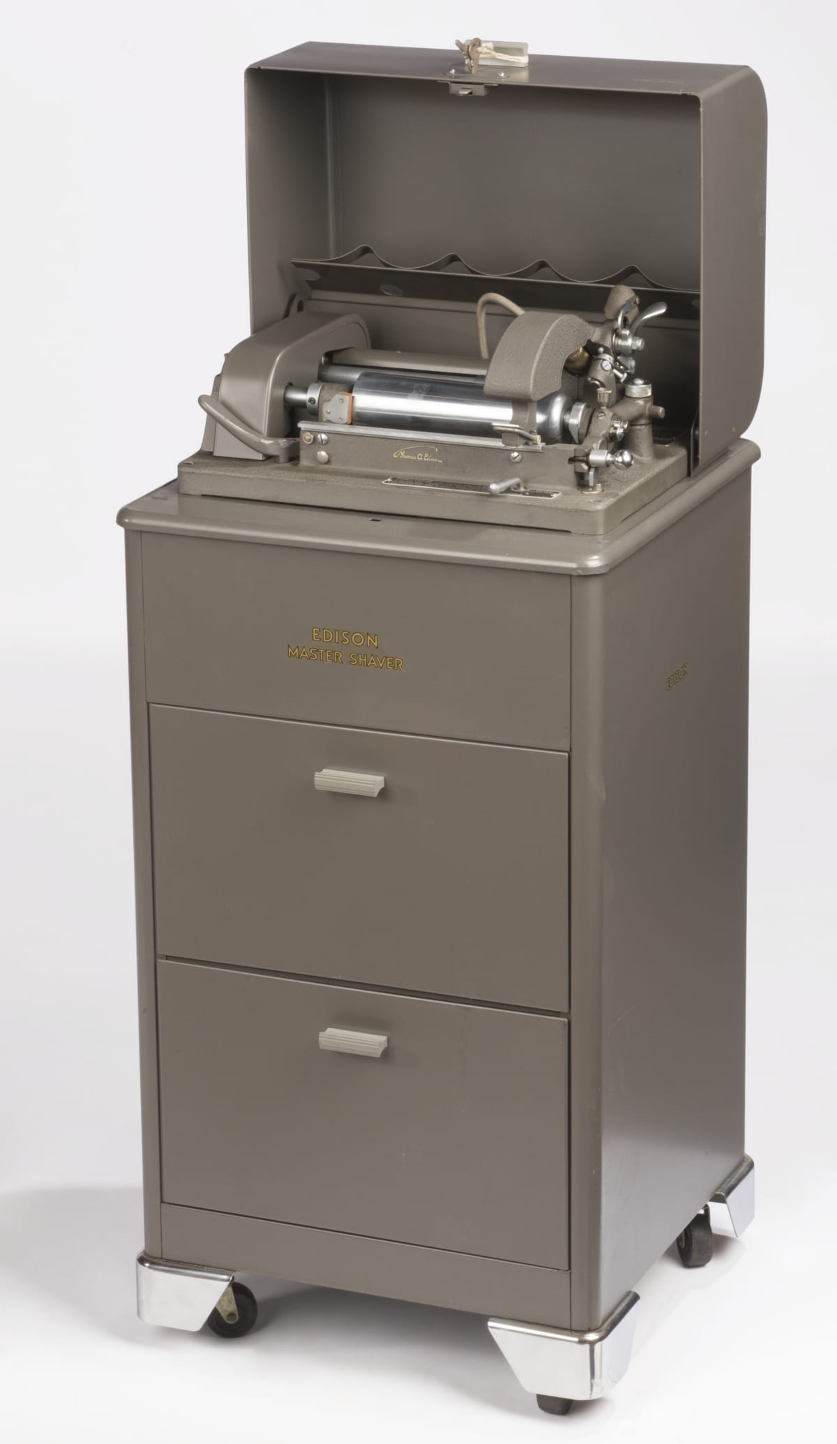 Dictaphones and Ediphones were sound recording devices largely used for oral dictation in business settings. In this scenario, wax cylinder recordings were passed to a secretary, who listened to the recording with a playback-only transcriber and then typed up notes. A shaving machine, such as this one, scraped the previously inscribed layer away allowing a wax cylinder to be reused over 100 times.