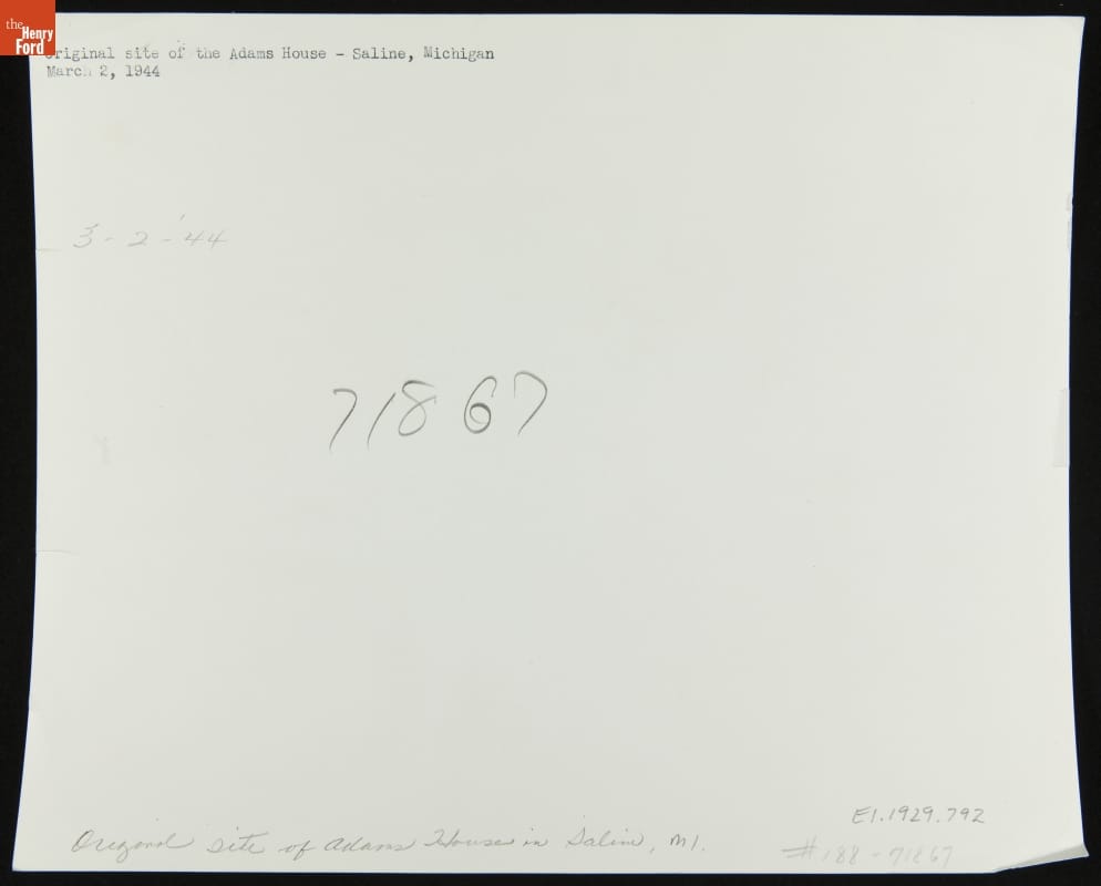 This photograph shows the new house built at the former location of the Adams family home in Saline, Michigan. On this site George Matthew Adams, a well-known columnist in the early 1900s, was born and raised. Henry Ford admired Adams's writing, and in 1937, he moved Adams's house to Greenfield Village--Ford's historical outdoor museum in Dearborn, Michigan.