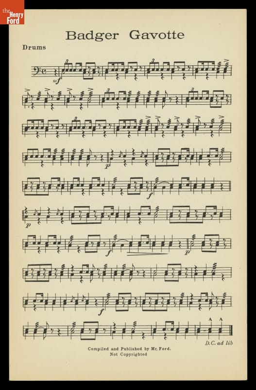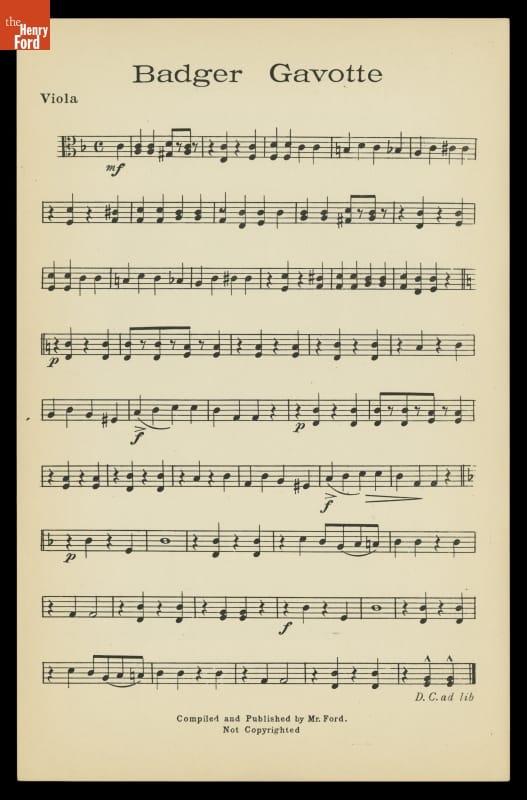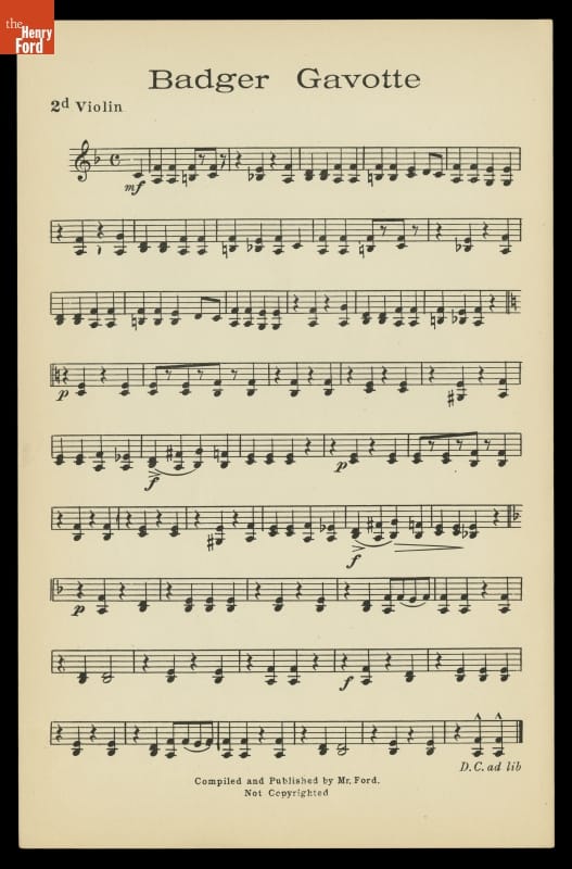 In the 1920s, Henry Ford thought the old-fashioned dances of his youth should be revived. So he published a book of dance instruction--and also this sheet music for school orchestras or community musicians who wished to provide live music for 19th century dances like the reel, quadrille, schottische, and gavotte. The music included parts for violin, bass, cello, viola, clarinet, flute, piano, trumpet, trombone, and drums.