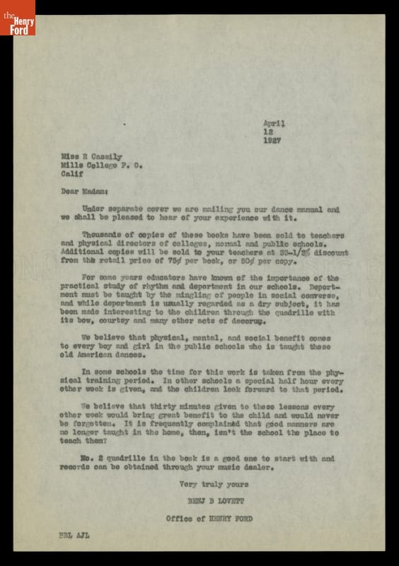 In the mid-1920s, Henry Ford was on a crusade to revive the old-fashioned dances of his youth. To encourage participation, Ford published a dance manual, called "Good Morning," and produced recordings of the dance music (with and without the caller calling the steps). Many schools--including colleges--added traditional American dancing to their physical education curriculum.