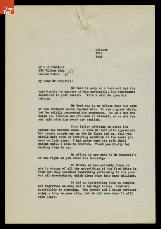 Letter from Benjamin Lovett to J. B. Cranfill, October 17, 1927
