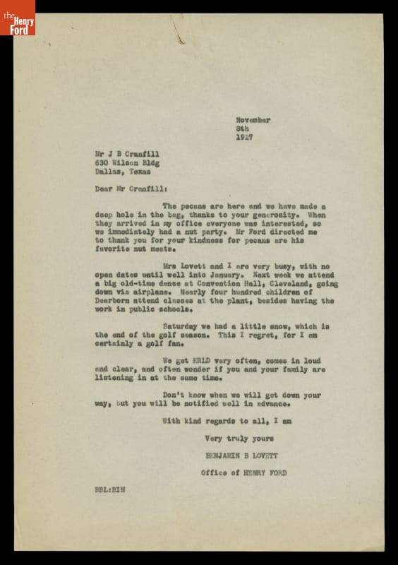 Letter from Benjamin Lovett to J. B. Cranfill, November 8, 1927