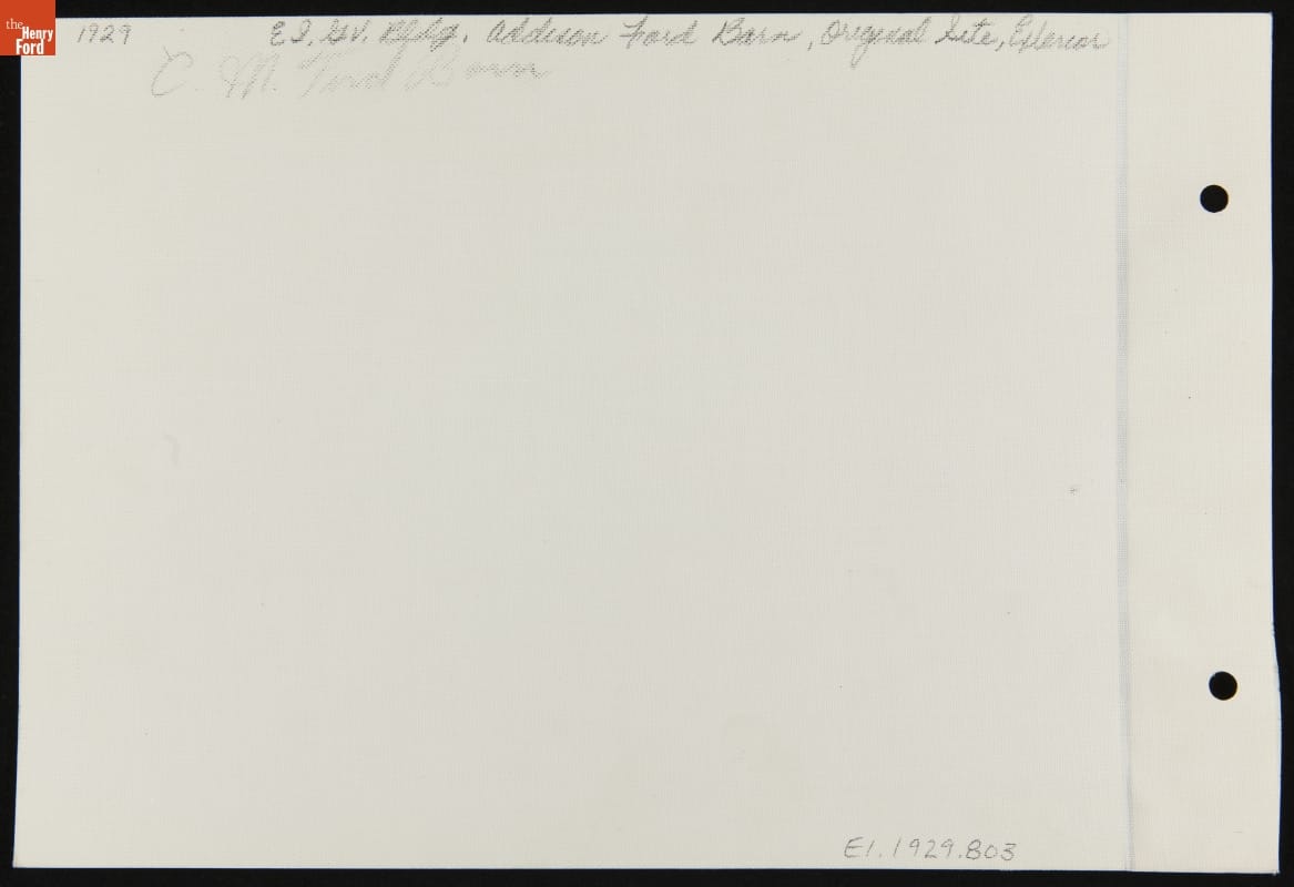 In 1928, Henry Ford acquired the late-1800s barn located on land once owned by Addison Ford, his second cousin. Henry had the structure dismantled and moved to Greenfield Village. Here it was modified and used for non-historic purposes--it accommodated stalls for some twenty riding horses. The barn was razed in 1993. This photograph documents the barn prior to its move to Greenfield Village.