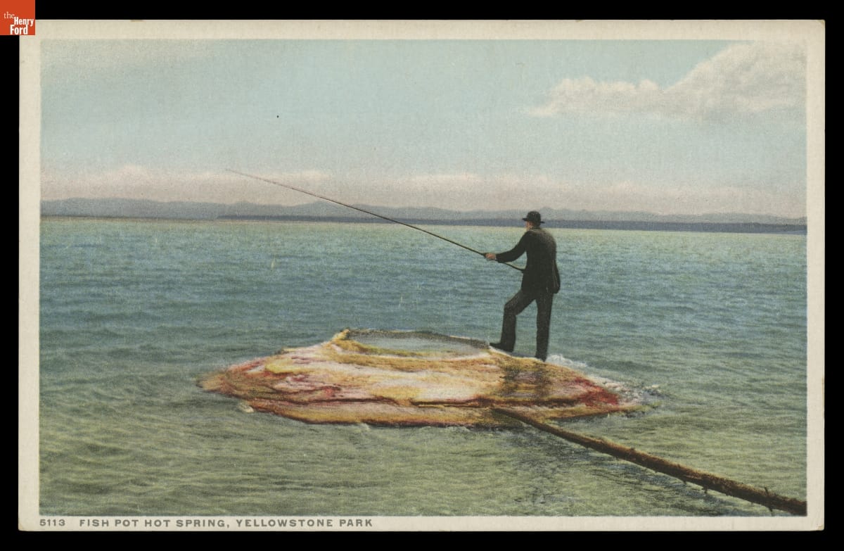 Yellowstone National Park, established 1872, was America's first national park. Fish Pot Hot Spring, also called "Fishing Cone," is a shoreline geyser that protrudes from the bottom of Yellowstone Lake. Early tourists claimed that they could catch a trout from the lake and cook it by dipping it into the spring's boiling water. This practice was prohibited in the 1930s.