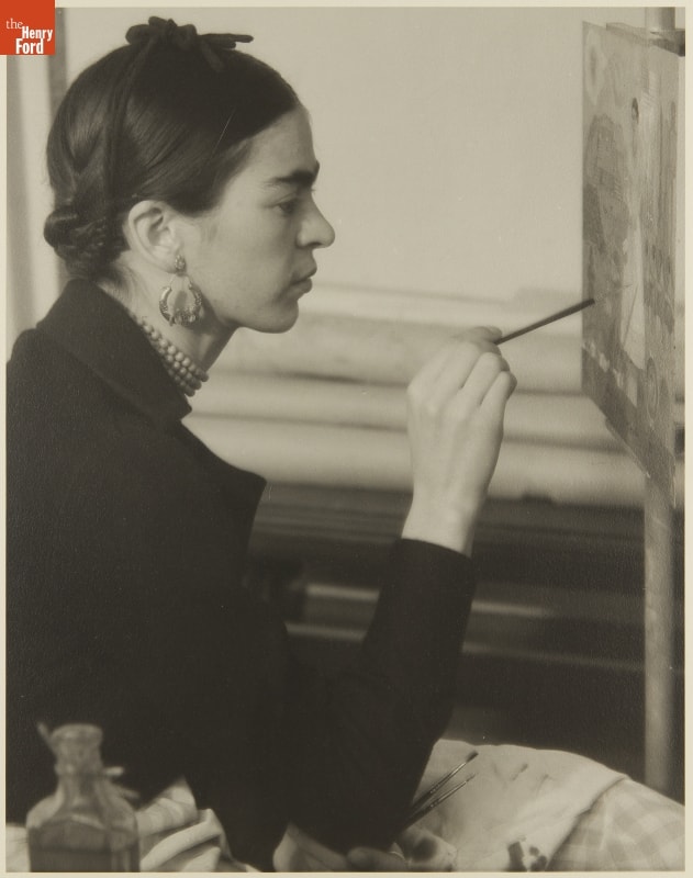 Artist Frida Kahlo was photographed in Detroit while working on her Self-Portrait on the Border Line between Mexico and the United States in 1932. She relocated to Michigan while her husband, Diego Rivera, completed a commission for the Detroit Institute of Arts. Other paintings done by Kahlo during her stay included Henry Ford Hospital and My Birth.