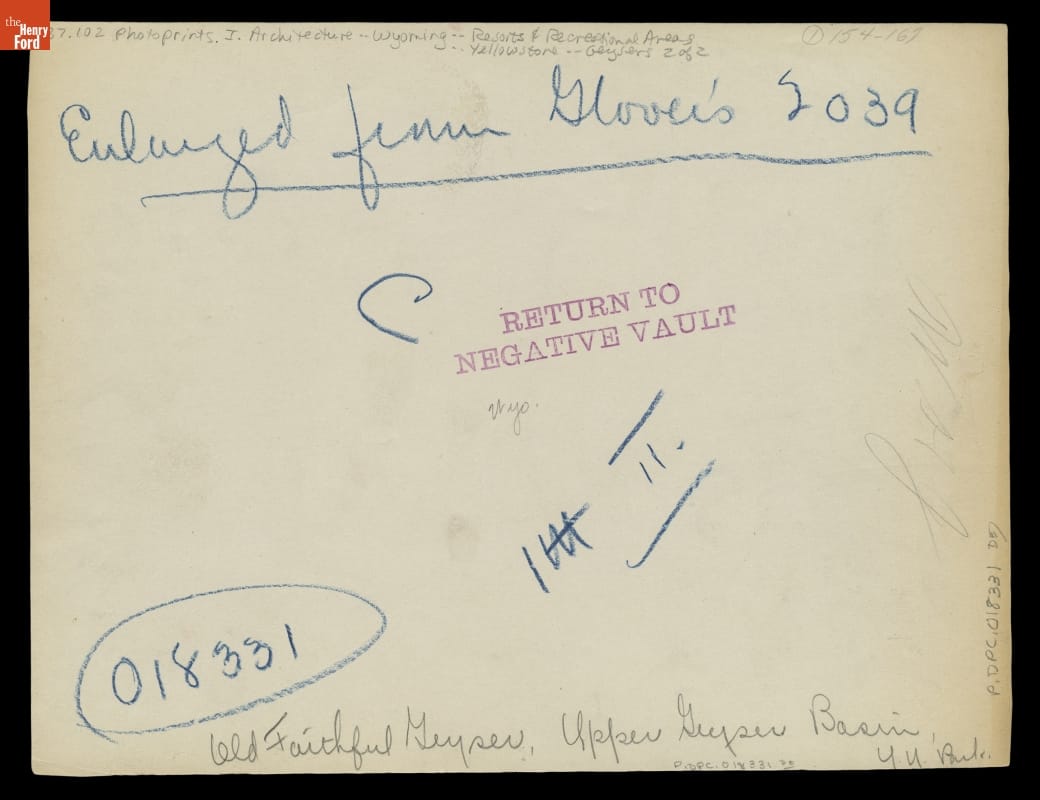 Marked on back: - Bottom, center, in pencil: Old Faithful Geyser, Upper Geyser Basin / Y. N. Park - Left, in blue pencil: 018331 (circled) / C / [various proofer marks] - Top, in blue pencil: Enlarge from Glover 2039 - Center, in pencil: Wyo - Red ink stamp, center right: RETURN TO NEGATIVE VAULT