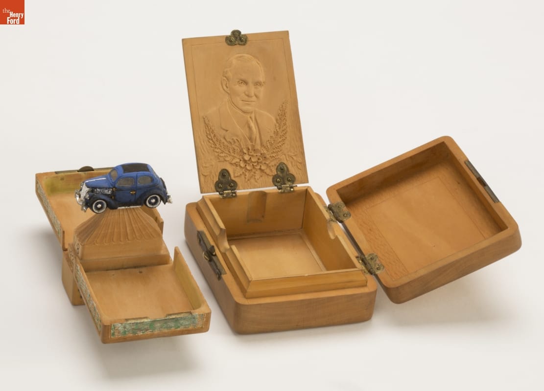 Acknowledging Henry Ford's innovative spirit, individuals employing their own original and imaginative efforts bestowed hundreds of handmade gifts upon him. This intricate and elaborate carving is covered with images of objects and places significant in the life of Henry Ford, representing his past and present, his industrial world as well as his creation of Greenfield Village.