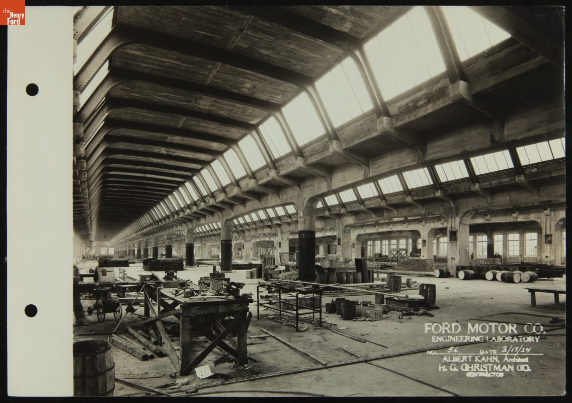 In 1923, construction began on Ford Motor Company's first purpose-built engineering laboratory building. The massive Albert Kahn-designed structure -- essentially a single light-filled room -- housed tool design, production engineering, and experimental engineering research departments. It also housed the offices and presses for the Dearborn Independent, and space for Henry Ford's growing artifact collection. The building was completed in December 1924.