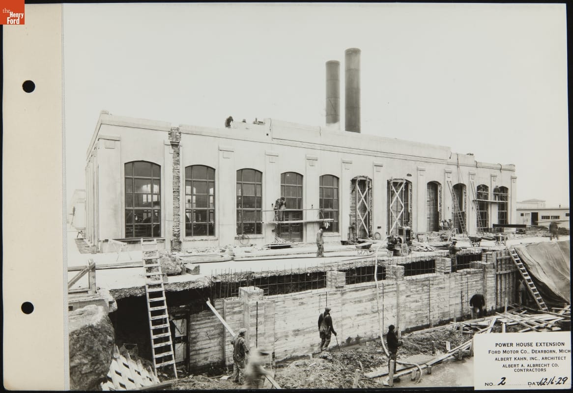 Work began on the expansion of the old powerhouse located near the Ford Motor Company Engineering Laboratory in the late 1920s. The building's new equipment would send high pressure steam through underground tunnel extensions to Henry Ford's other Dearborn construction projects -- his museum and Ford Airport. The Albert Kahn-designed structure was completed in 1930.