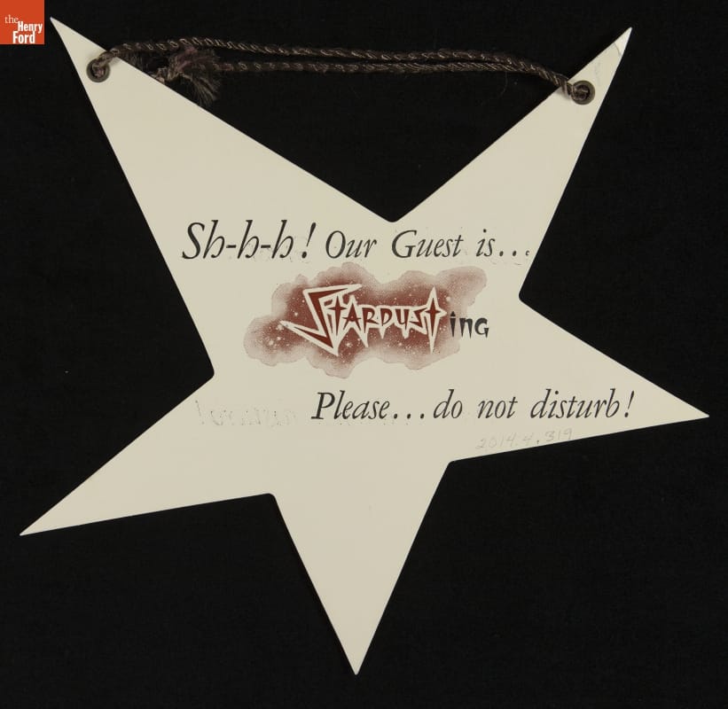 Most weary travelers want peace and quiet when staying at a hotel, motel or inn. In the mid-20th century -- just like today -- proprietors provided guests with ways to help make their stay pleasant and restful. Signs hung outside on the door alerted staff to guests' needs. This clever sign not only told staff the occupant was sleeping ("Stardusting"), but promoted name recognition of the Stardust Hotel with the guest.