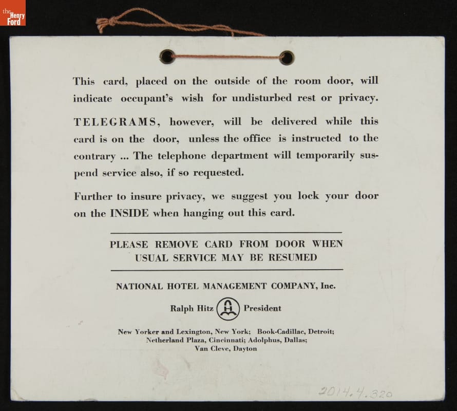 Like today, proprietors of mid-20th century hotels, motels and inns provided "Do Not Disturb" signs for weary travelers who wanted a restful stay. Guests placed the sign outside on their door to alert staff to please be quiet and not enter the room. This sign even included instructions that guests could use to stop unwanted telegrams or telephone calls.