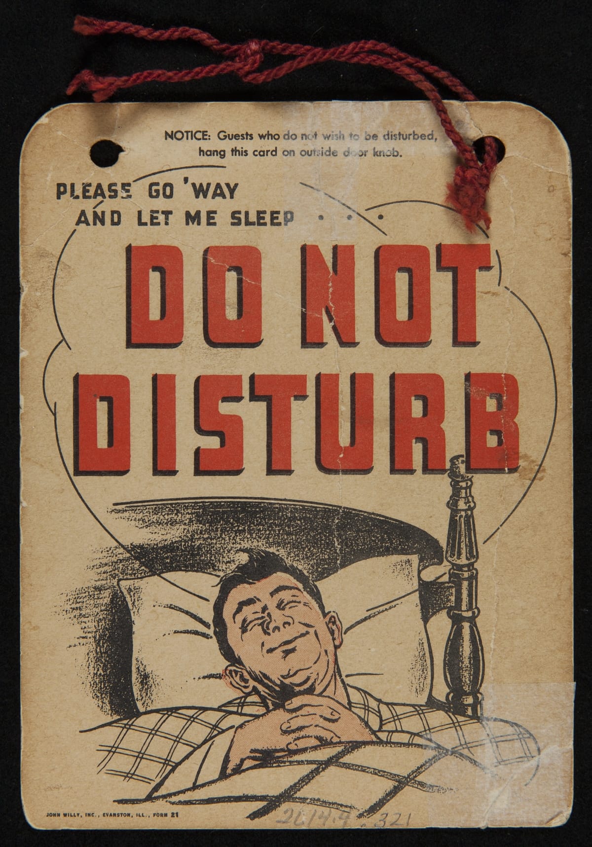 Most weary travelers want peace and quiet when staying at a hotel, motel or inn. In the mid-20th century -- just like today -- proprietors provided guests with a "Do Not Disturb" sign to help make their stay pleasant and restful. Hanging the sign outside on the door alerted staff not to enter. Some signs were simple. Others, like this one, added a humorous image that reinforced the guest's wishes.
