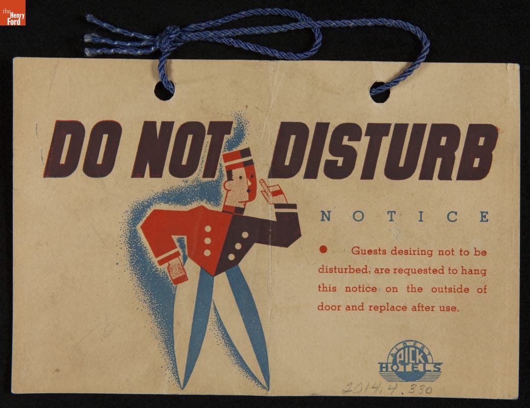 Most weary travelers want peace and quiet when staying at a hotel, motel or inn. Guests in the mid-20th century -- just like today -- found a sign in their room to help make their stay pleasant and restful. Hanging the sign outside on the door alerted staff to be quiet and not enter. This simple sign says it all "Do Not Disturb."