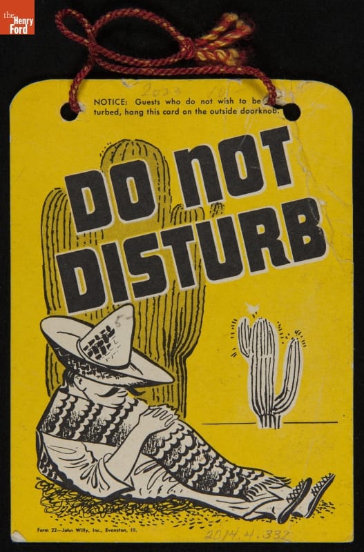 Most weary travelers want peace and quiet when staying at a hotel, motel or inn. In the mid-20th century -- just like today -- proprietors provided guests with a "Do Not Disturb" sign to help make their stay pleasant and restful. Hanging the sign outside on the door alerted staff not to enter. Some signs were simple. Others, like this one, added a humorous image that reinforced the guest's wishes.