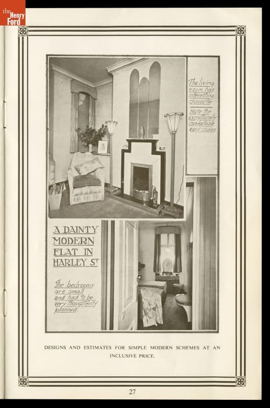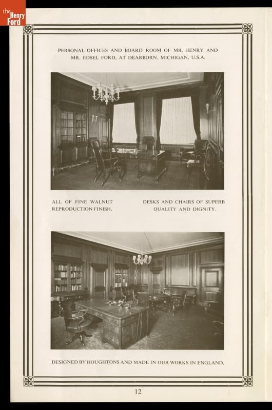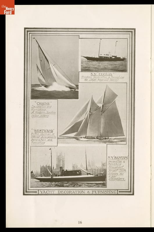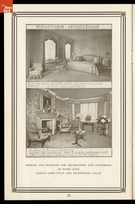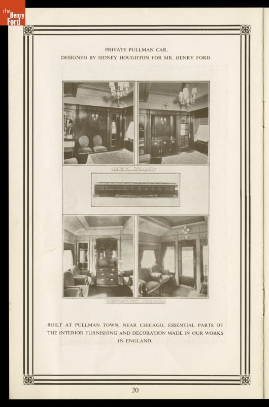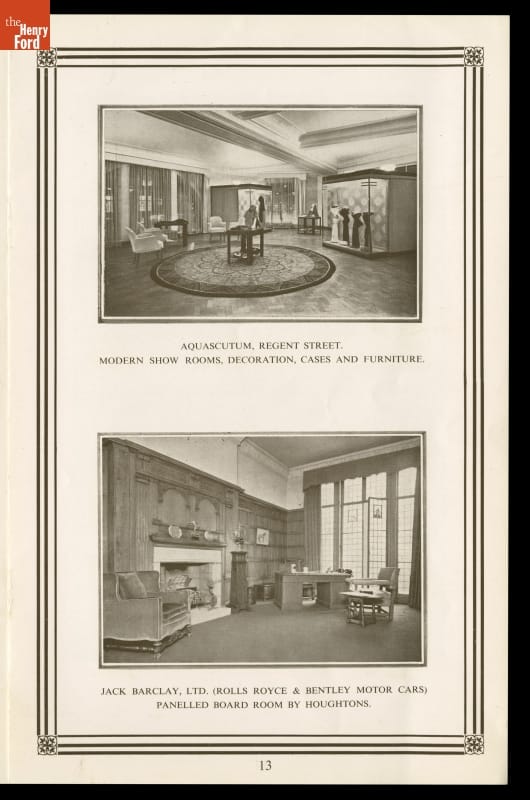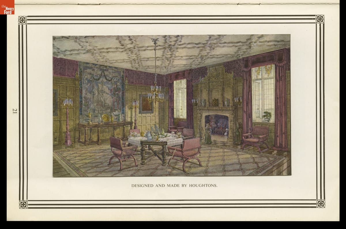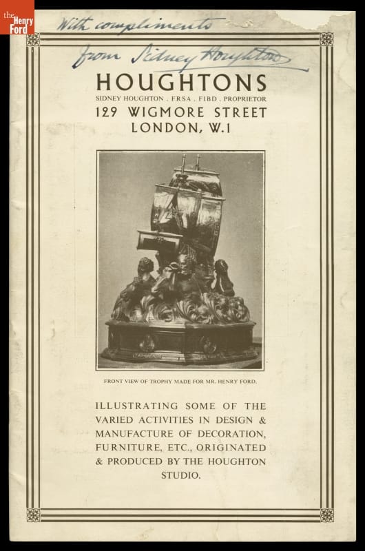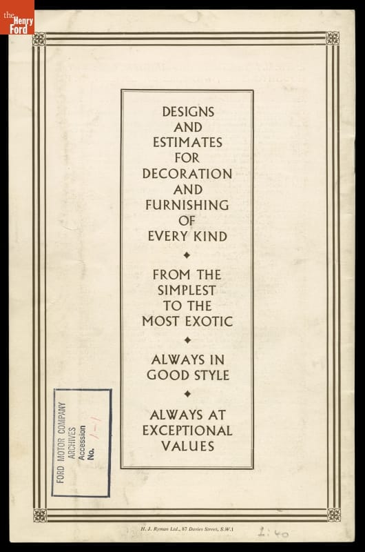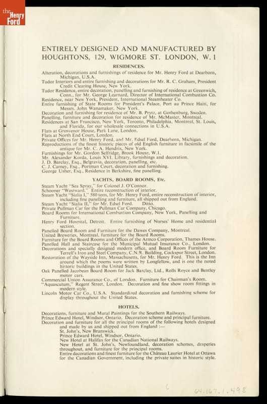London-based interior designer Sidney Houghton was commissioned by Henry Ford for several projects. This catalog contains samples of Houghton's work. It features designs for the Sialia yacht, the Fair Lane private railcar, Wayside Inn, and Henry Ford's and Edsel Ford's offices in the Ford Engineering Laboratory. Houghton also worked on the Dearborn Country Club and Henry Ford's Fair Lane estate.