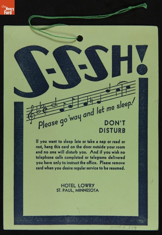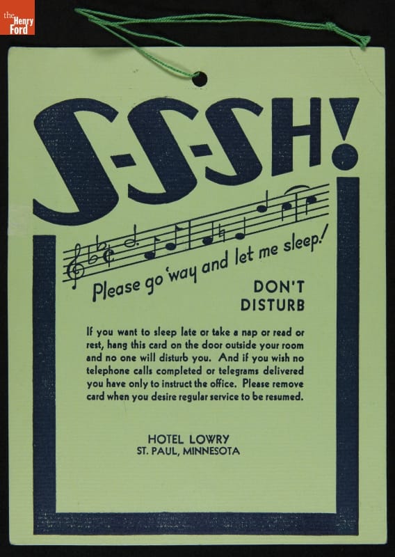 Front of sign: S-S-S-H! / Please go 'way and let me sleep! / DON'T / DISTURB / If you want to sleep late or take a nap or read or / rest, hang this card on the door outside your room / and no one will disturb you. And if you wish no / telephone calls completed or telegrams delivered / you have only to instruct the office. Please remove / card when you desire regular service to be resumed. / HOTEL LOWRY / ST. PAUL, MINNESOTA