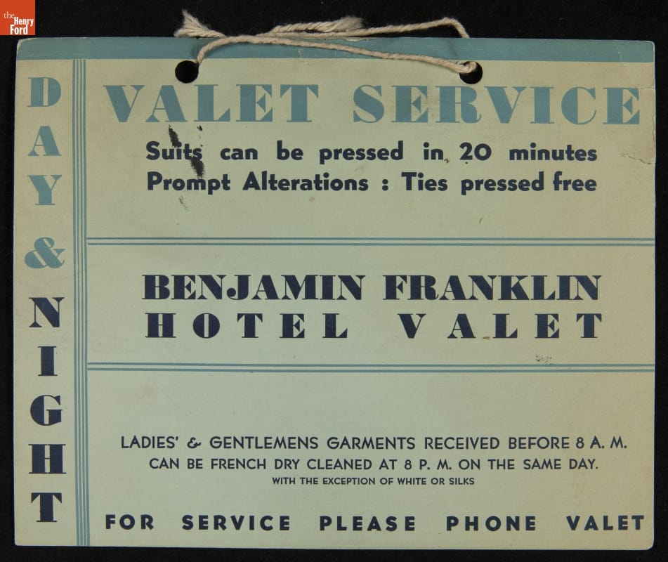 Keeping clothes clean and fresh is hard to do when traveling. Many mid-20th century hotels provided valet service for travelers -- especially businesspersons who may return. Guests at the Benjamin Franklin Hotel who needed valet service found this sign conveniently located in their room. A quick call and guests could receive a number of garment cleaning and alteration services "Day & Night."