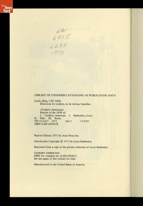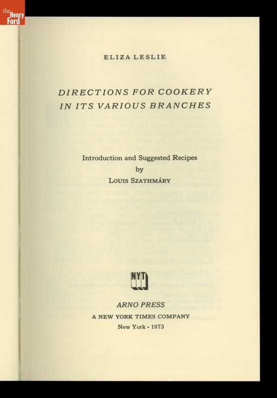 Directions for Cookery, in Its Various Branches, 1973 (Reprint of the 1848 Edition)
