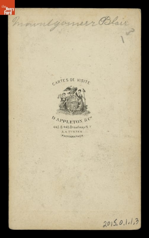 Cartes-de-visite, small, professionally made photographs on cardboard stock, remained popular in the United States from the Civil War in the 1860s through the 1880s. Many were given to friends and loved ones, but enterprising photographers also produced images of famous individuals to sell to the collecting-crazed public. Celebrities, military officers and politicians, such as Montgomery Blair, Abraham Lincoln's first postmaster general, were popular subjects.
