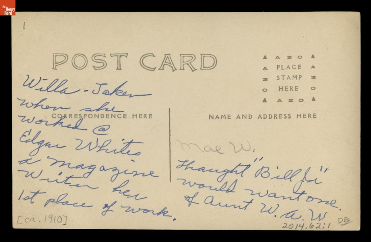 Willa- Taken / when she / worked @ / Edgar Whites a magazine / writer her / 1st place of work. / Thought "Bill Jr" / would want one / of Aunt W.A.W.