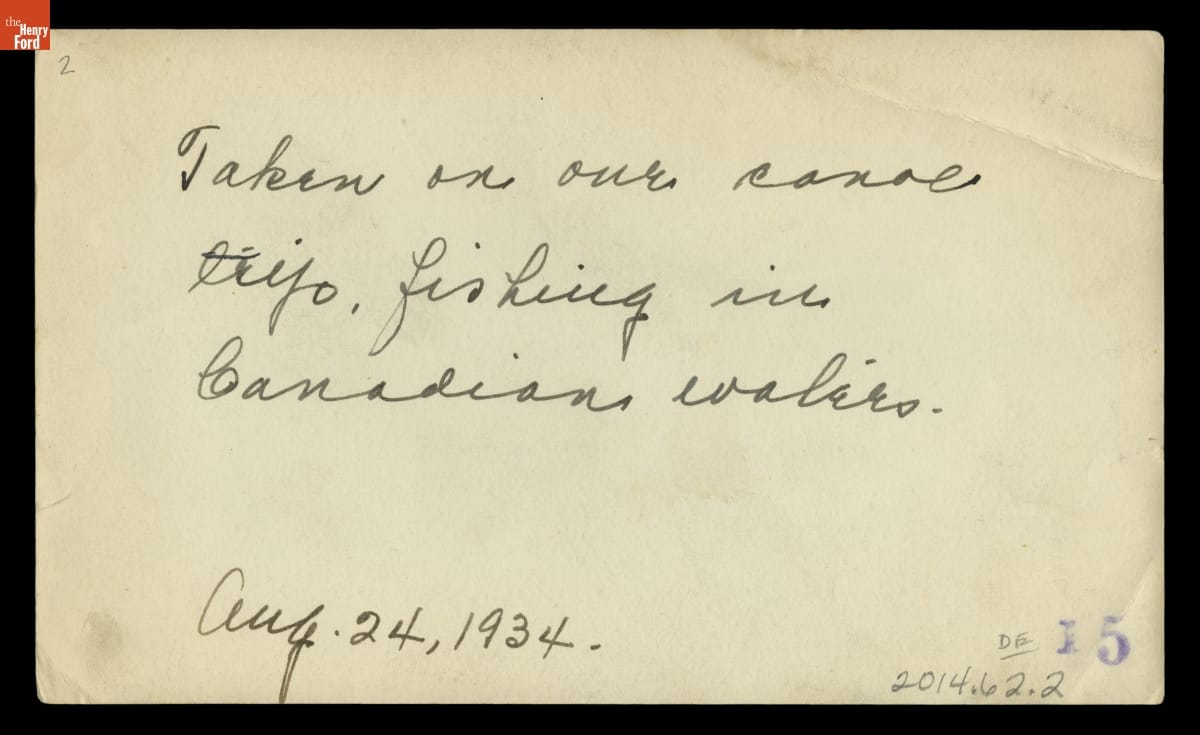 Taken on our canoe / trip, fishing in / Canadian waters. / Aug. 24, 1934
