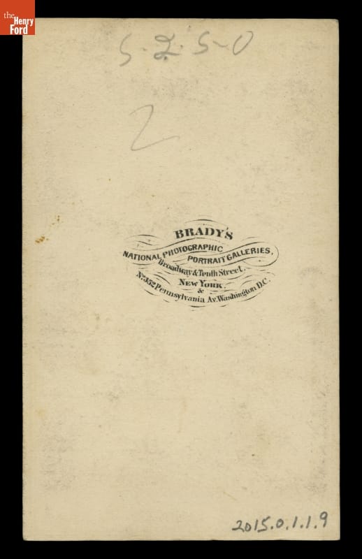 Text of on back: BRADY'S / NATIONAL PHOTOGRAPHIC / PORTRAIT GALLERIES, / Broadway & Tenth Street, NEW YORK, / No 3521 Pennsylvania Ave. Washington D.C.