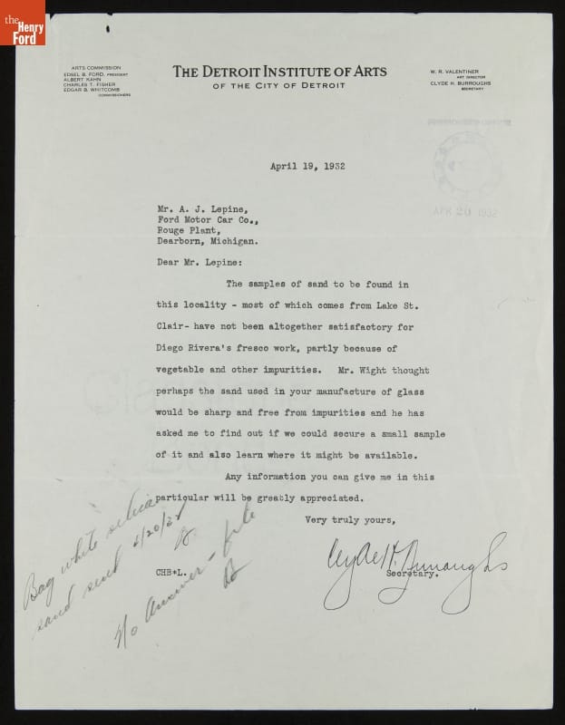 Letter from Clyde Burroughs to A. J. Lepine (for Edsel Ford) regarding Sand Used in Rivera Frescos, April 19, 1932