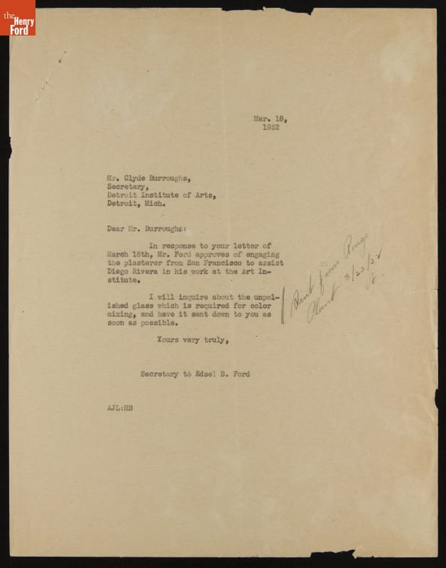 Letter from A. J. Lepine (for Edsel Ford) to Clyde Burroughs regarding Engagement of Assistant Plasterer, March 18, 1932