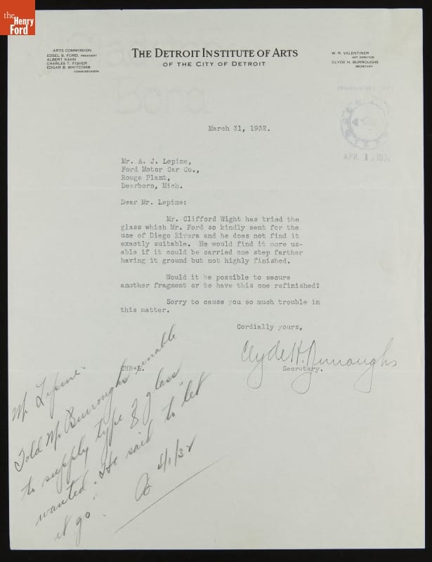 Letter from A. J. Lepine (for Edsel Ford) to Clyde Burroughs regarding Glass Used by Diego Rivera, March 31, 1932