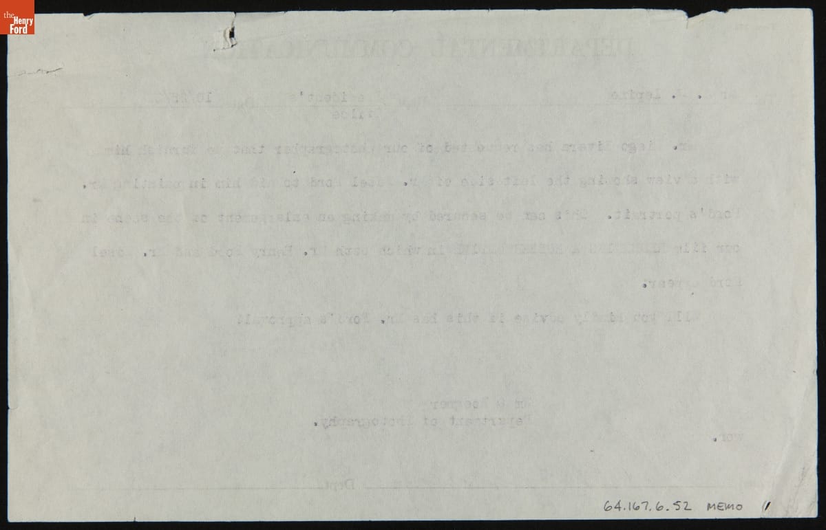 Partway through work on his Detroit Industry murals at the Detroit Institute of Arts in 1932, Diego Rivera painted a portrait of the frescoes' primary sponsor, Edsel Ford. Rivera requested several photographs of Ford to assist with the portrait. Because of concerns over privacy and security, special permission was required to supply the photos.