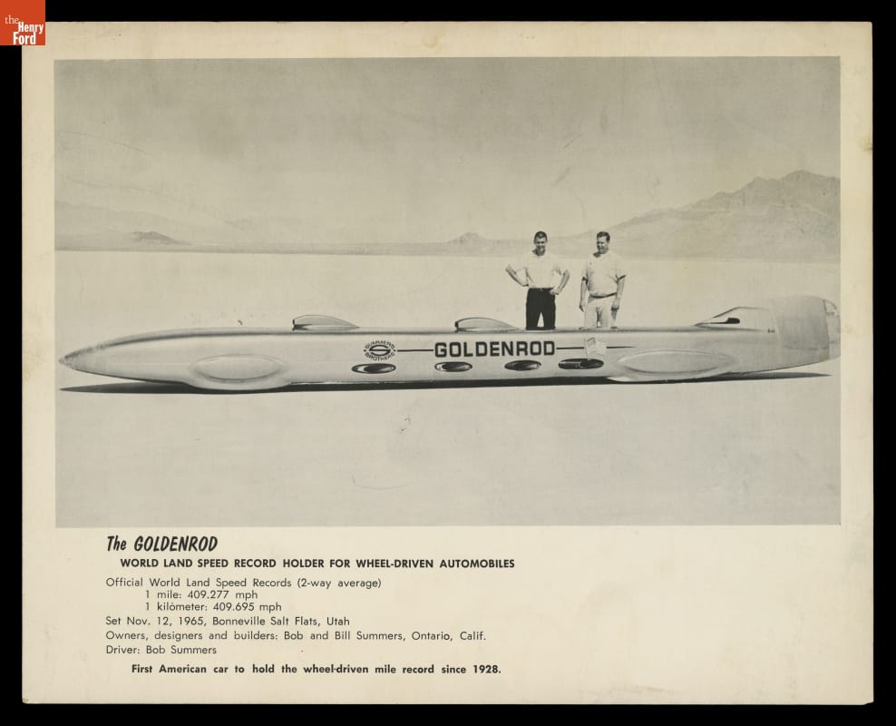 The GOLDENROD / WORLD LAND SPEED RECORD HOLDER FOR WHEEL-DRIVEN AUTOMOBILES / Official World Land Speed Records (2-way average) / 1 mile 409.277 mph / 1 kilometer: 409.695 mph / Set Nov. 12, 1965, Bonneville Salt Flats, Utah / Owners, designers and builders: Bob and Bill Summers, Ontario, Calif. / Driver: Bob Summers / First American car to hold the wheel-driven mile record since 1928.