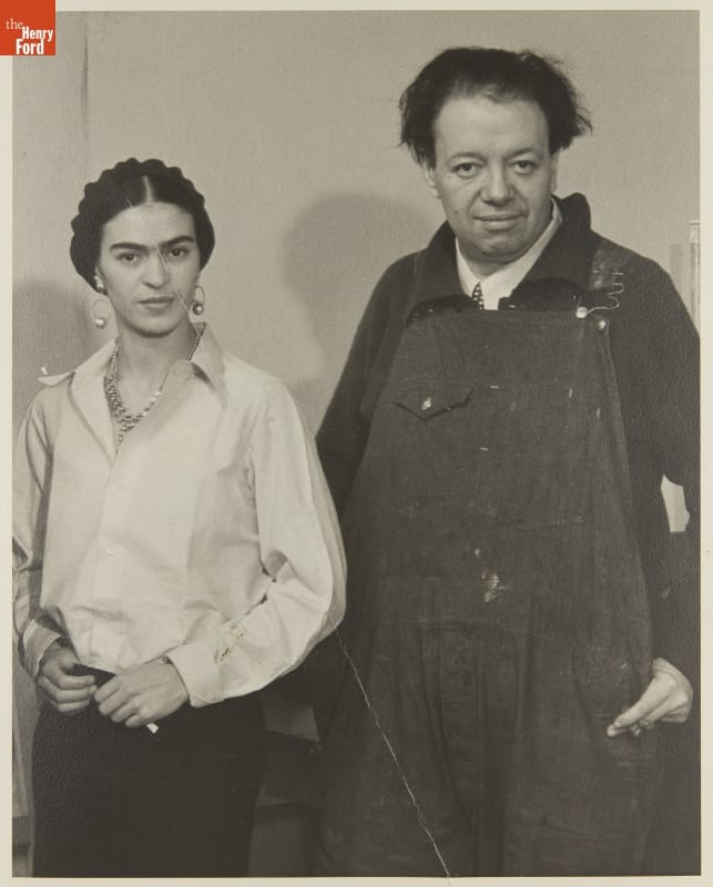 Frida Kahlo and Diego Rivera were photographed in Detroit in 1932. The couple resided in the city while Rivera created his Detroit Industry murals, commissioned by the Detroit Institute of Arts and completed there in 1933. Rivera's work was funded by Ford Motor Company president Edsel Ford.