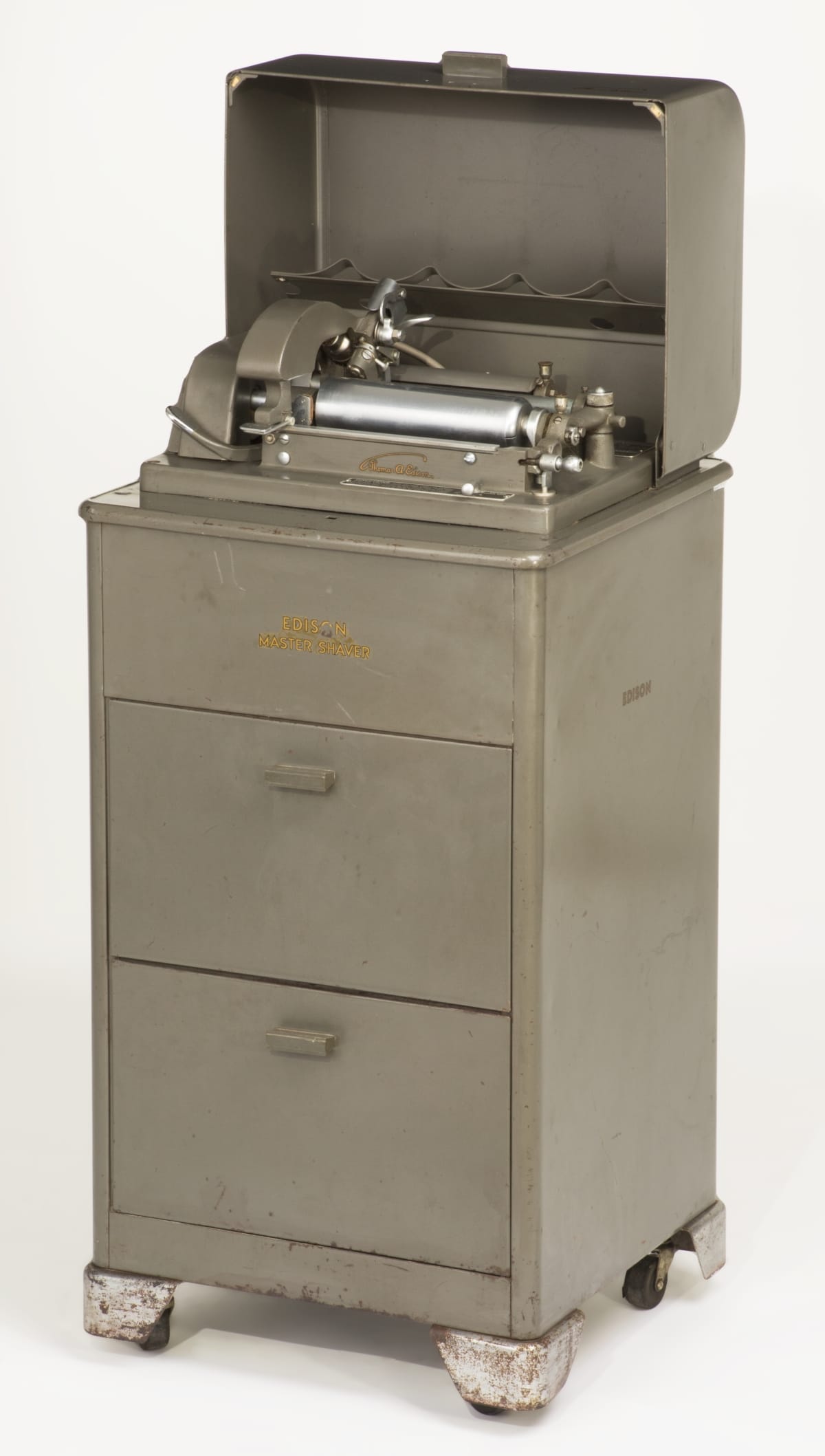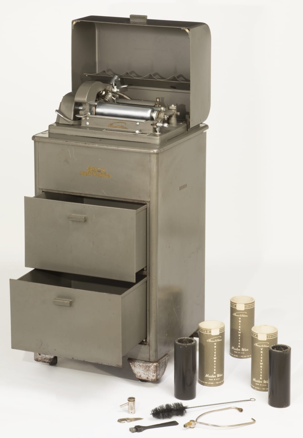 Dictaphones and Ediphones were sound recording devices largely used for oral dictation in business settings. In this scenario, wax cylinder recordings were passed to a secretary, who listened to the recording with a playback-only transcriber and then typed up notes. A shaving machine, such as this one, scraped the previously inscribed layer away allowing a wax cylinder to be reused over 100 times.