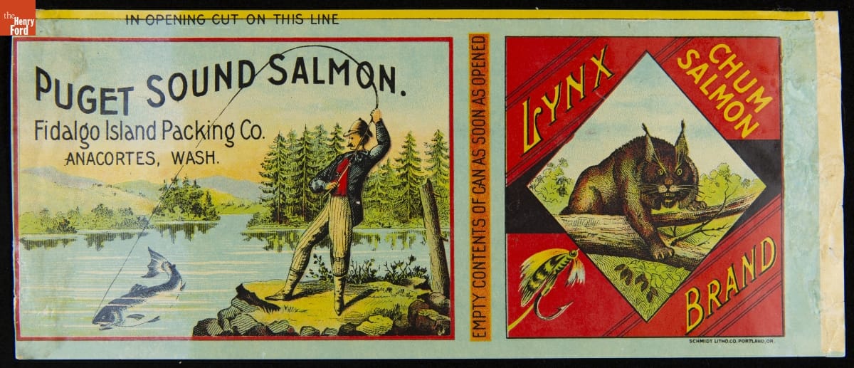 Manufacturers of similar products sought ways to make their company's goods stand out on store shelves. Attractive labels, like this eye-catching design for Fidalgo Island Packing Company salmon, helped catch the attention of potential customers and encourage them to purchase the company's product rather than that of a competitor.